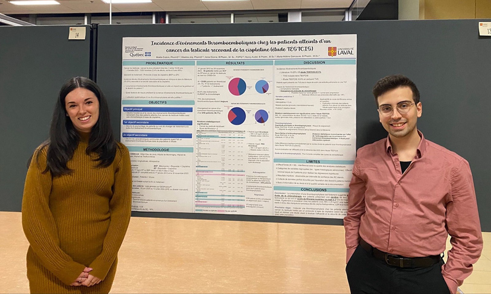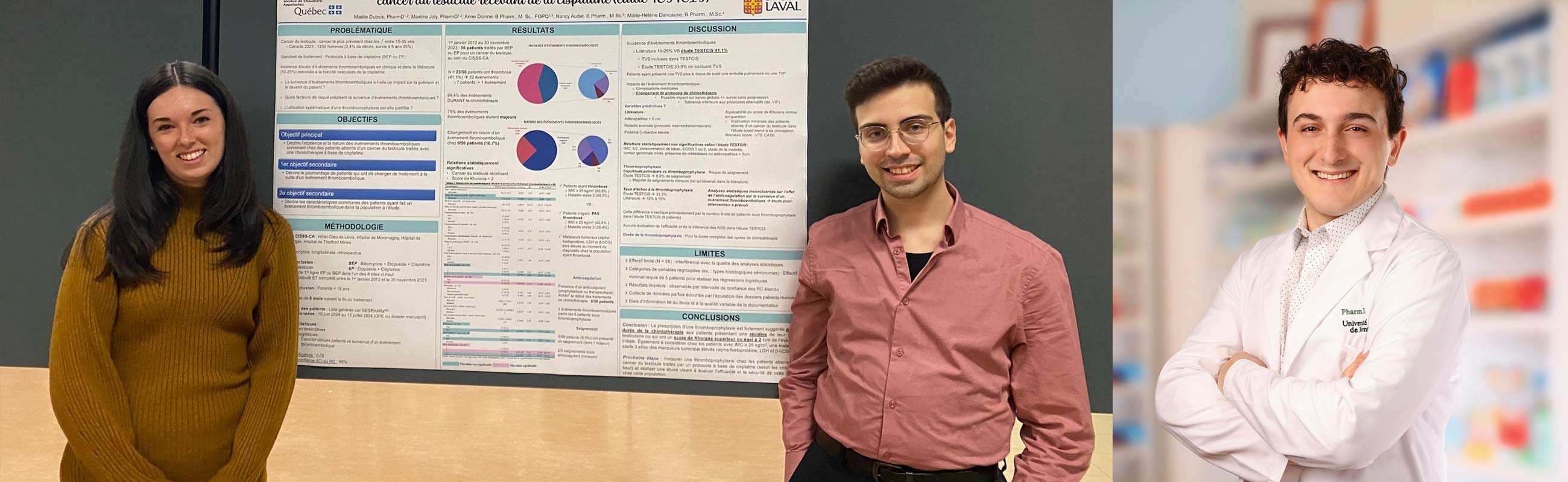 Du côté de l’Université Laval, Maxime Joly et Maélie Dubois, pharmaciens à l’Hôtel-Dieu de Lévis, CISSS de Chaudière-Appalaches, devaient présenter leur projet « Incidence d'événements thromboemboliques chez les patients atteints d'un cancer du testicule recevant de la cisplatine (étude TESTCIS) », pour lequel ils ont remporté la première place lors des présentations par équipe des projets de résidence.