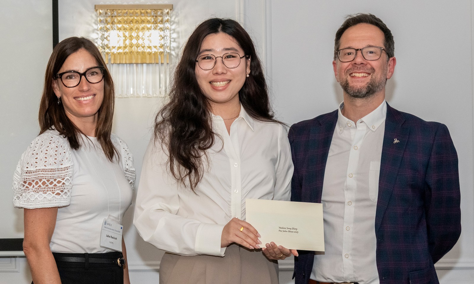Mme Julie Racicot, présidente du CA de l’A.P.E.S., Mme Jenny Zhang et M. Simon de Denus, doyen de la Faculté de pharmacien de l’Université de Montréal