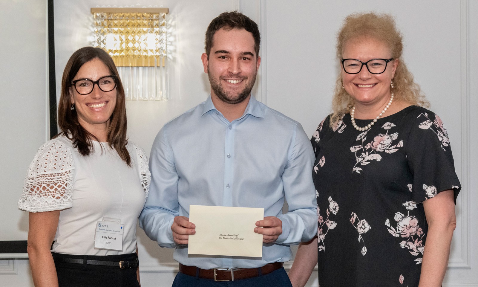 Mme Julie Racicot, présidente du CA de l’A.P.E.S., M. Samuel Dugal et Mme Julie Méthot, doyenne de la Faculté de pharmacien de l’Université Laval